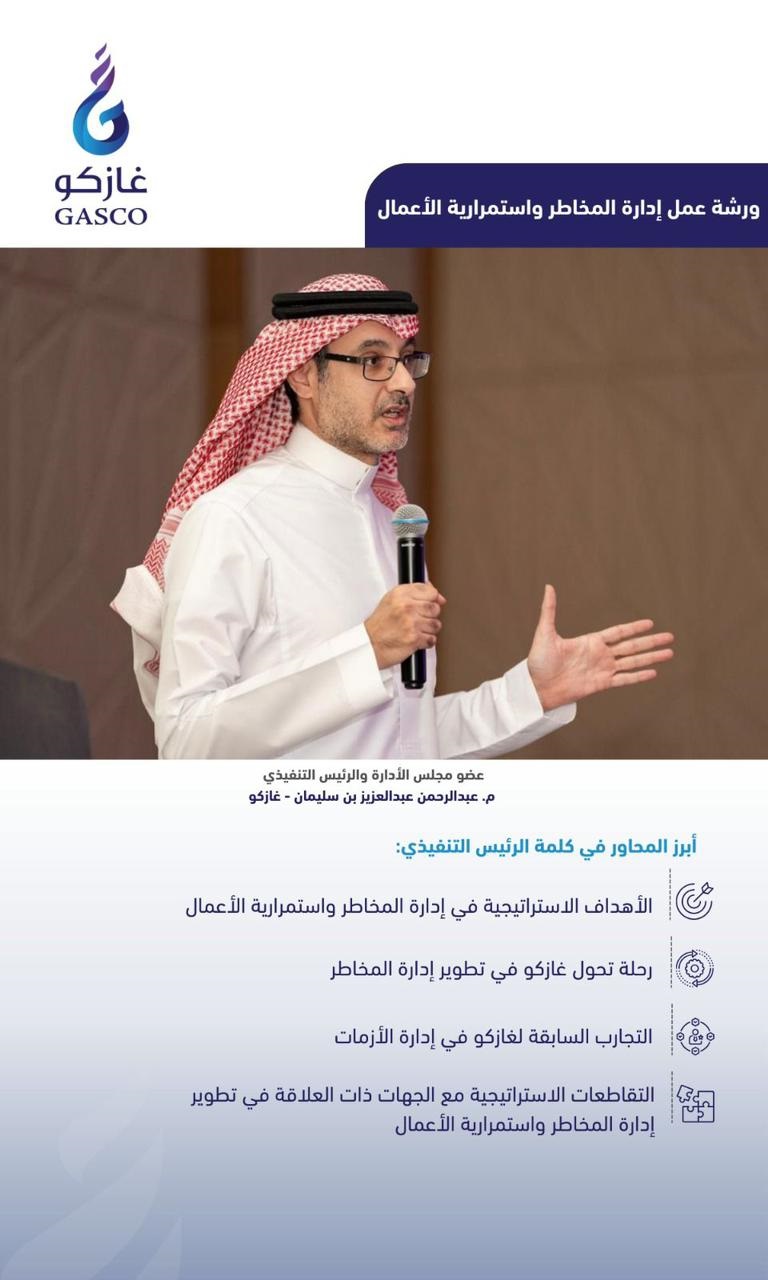أبرز ما جاء في كلمة المهندس عبدالرحمن بن عبدالعزيز بن سليمان الرئيس التنفيذي لـ غازكو خلال ورشة عمل إدارة المخاطر واستمرارية الأعمال. الاسبوع_التوعوي_للمخاطر_المؤسسية